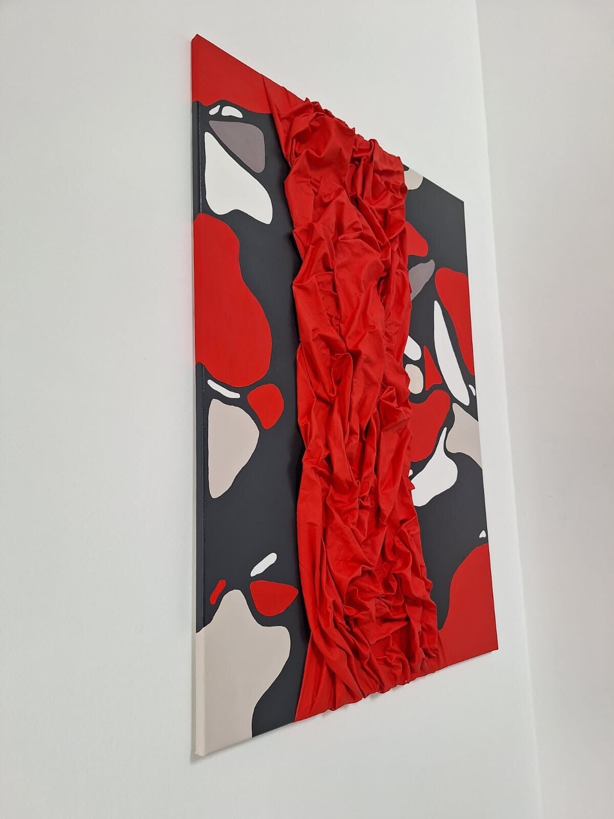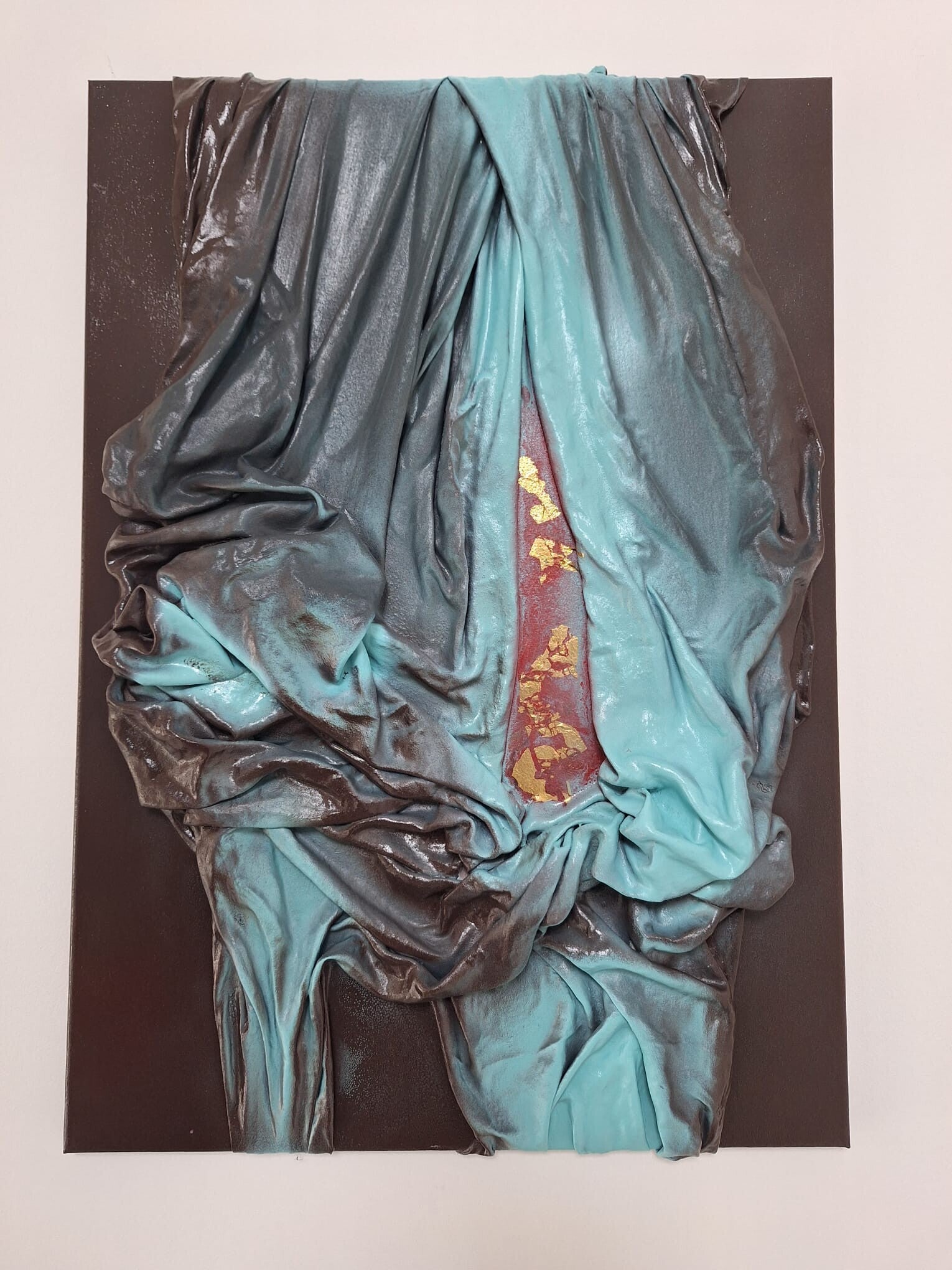 L'elemento centrale del mio quadro è un panneggio scultoreo che ho realizzato trattando il tessuto con il gesso, così da conferire rigidità e una forte dinamicità alla composizione.